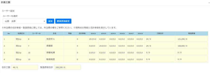 「TaskCompass(タスクコンパス)」では高機能な要員原価機能が実装されており、一人一人の原価を設定し煩雑な原価計算をスムーズに行えます。